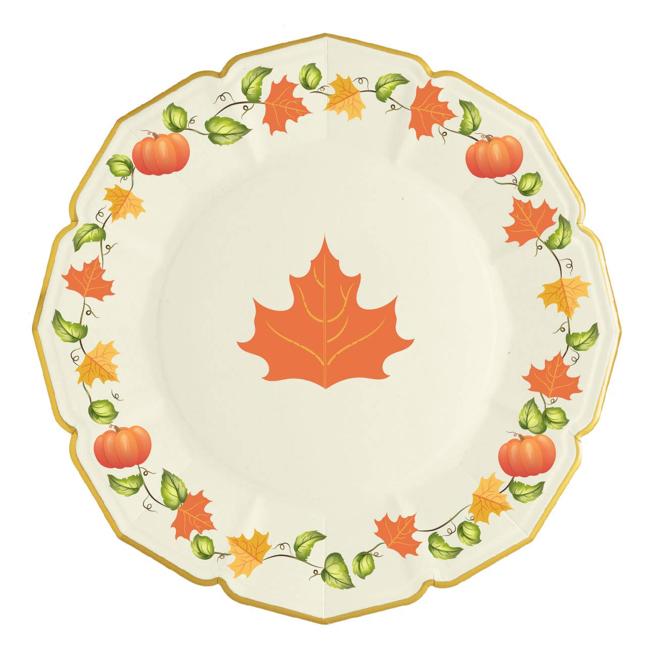 The perfect way to celebrate Thanksgiving. These porcelain-inspired plates feature a orange and copper foil leaf in center adorned with an elegant pumpkin and fall leaf border and finished with a copper foil scalloped edge.