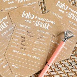 Create a sweet keepsake for baby and the parents-to-be with this adorable baby prediction and advice card. On card stock resembling kraft paper cut into a fun onesie shape, the white printed text outlines questions and an advice section for baby shower guests to fill out for the new parents.