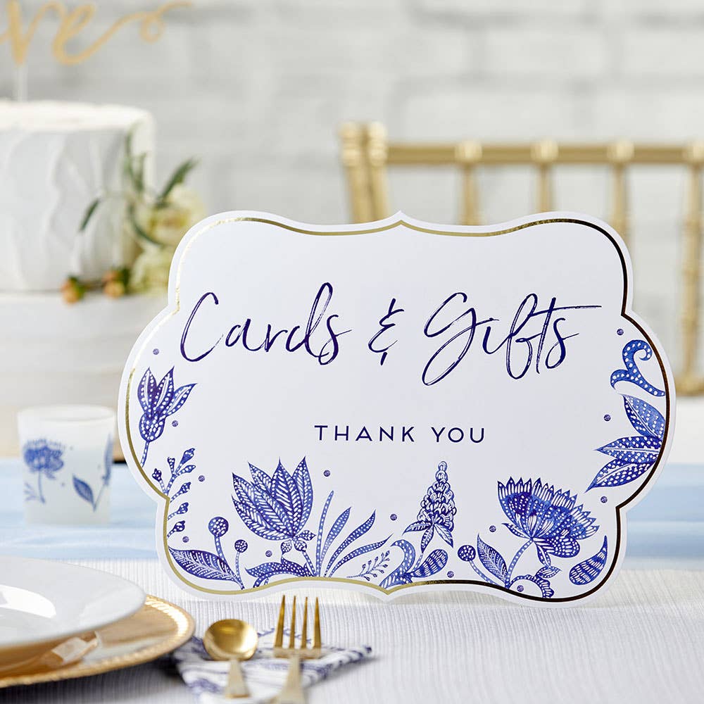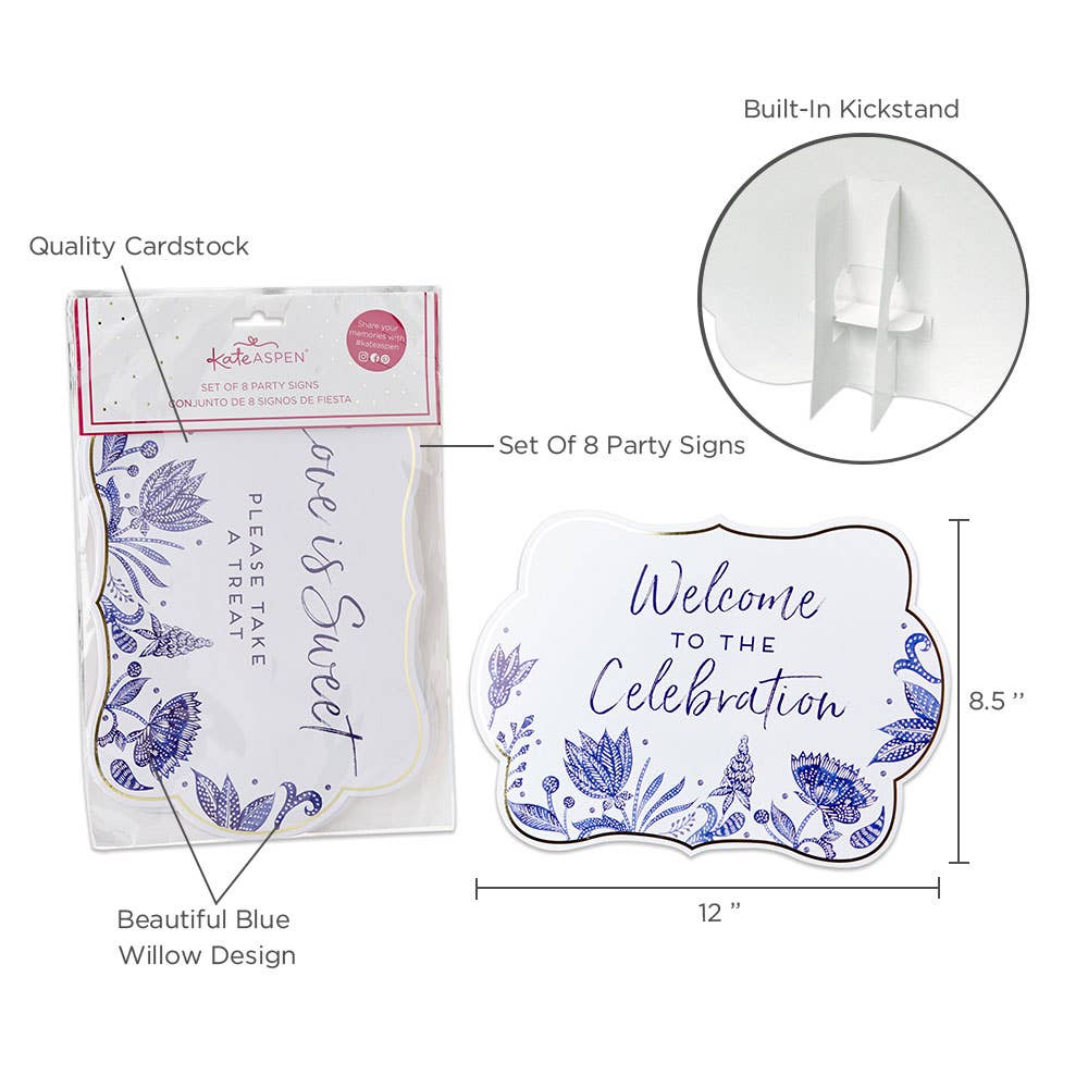 These premium signs have a white background, are accented with the blue willow motif and a gold foil border, and includes its message in blue text. Package includes a set of 8 signs, one of each of the following messages: