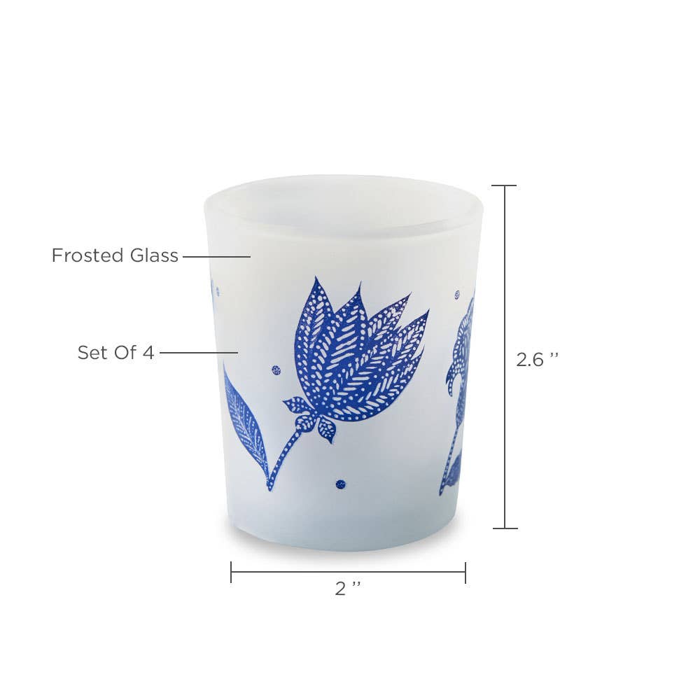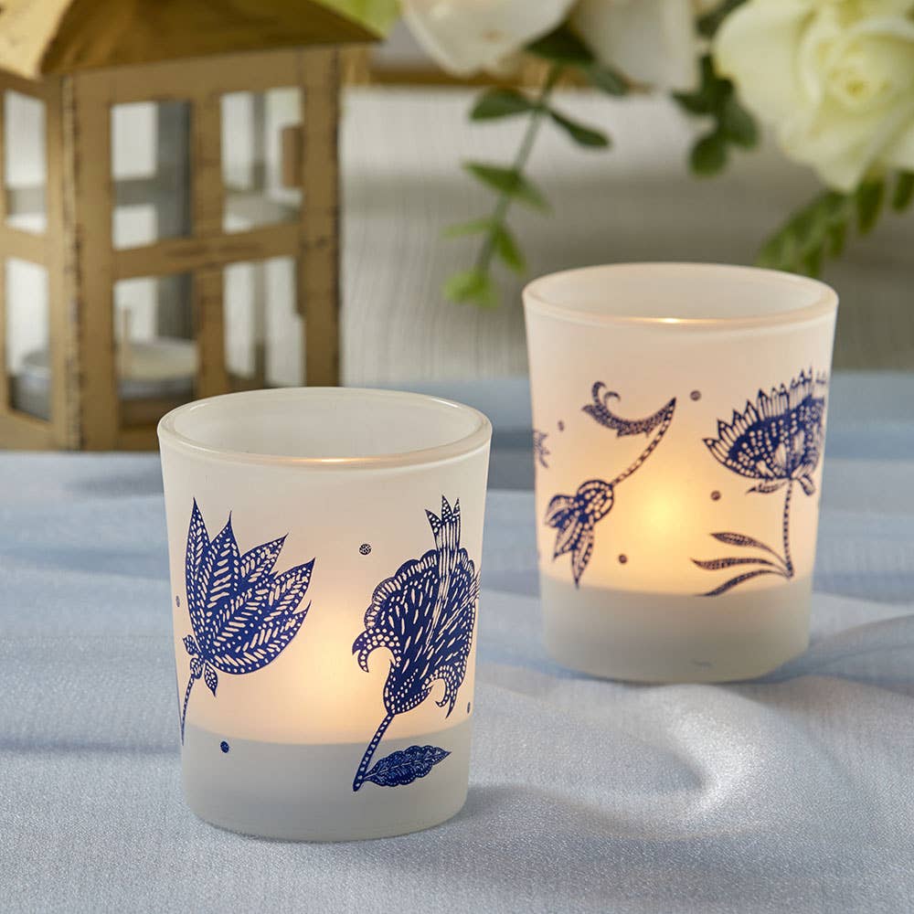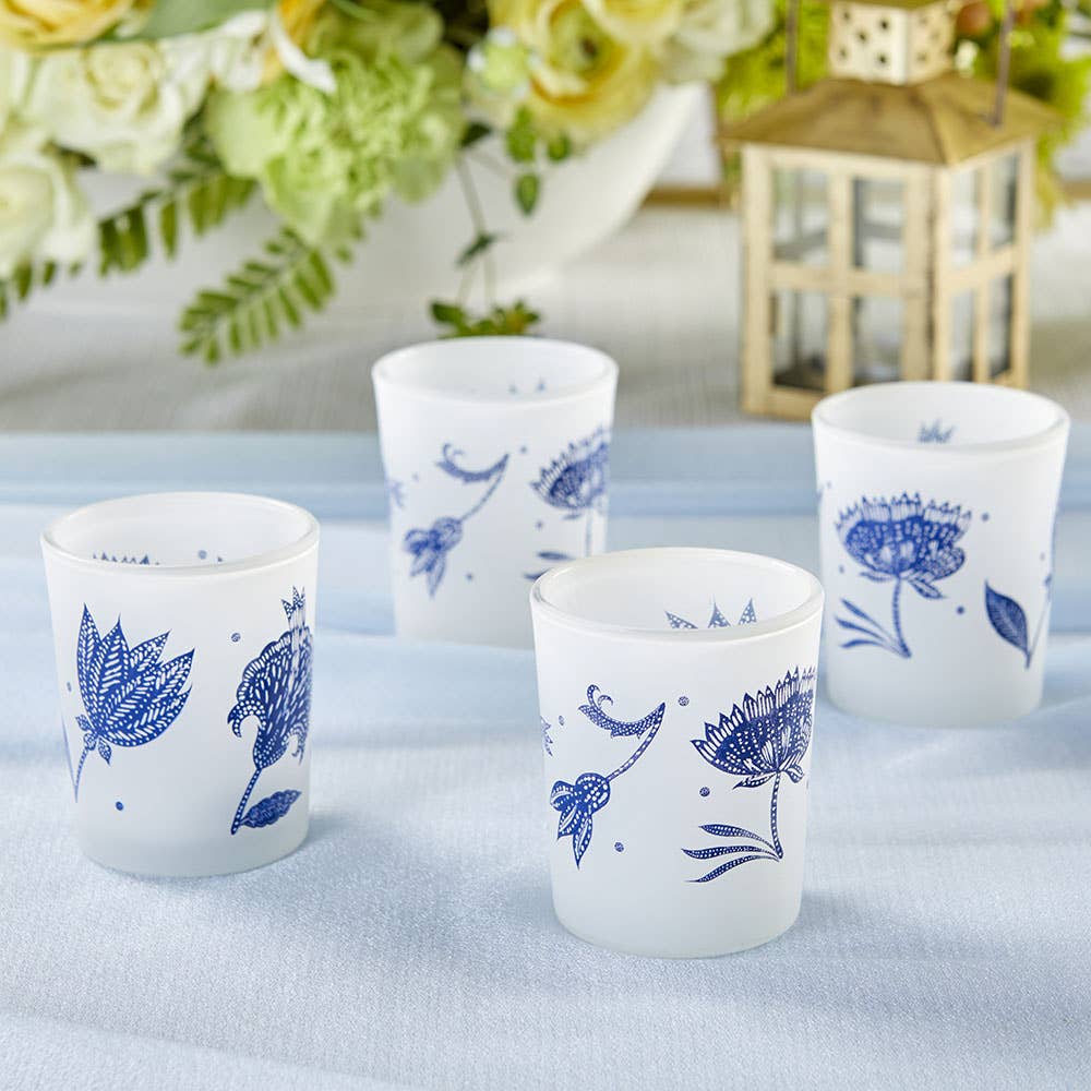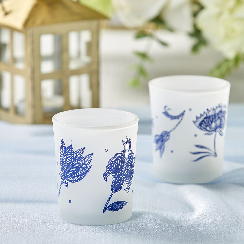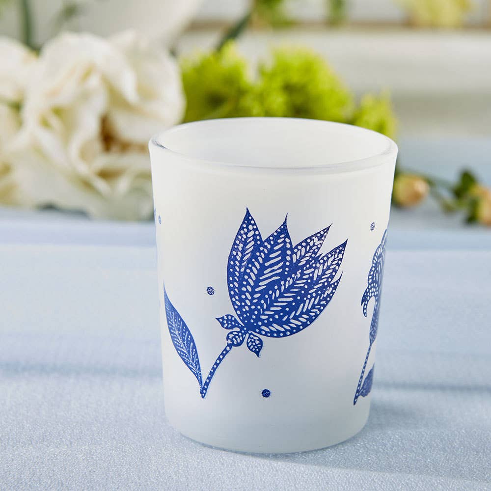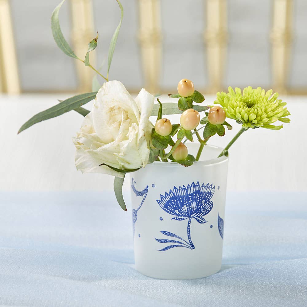The frosted Blue Willow glass votive has blue motifs around the sides of the white frosted glass. The dramatic contrast between the vintage blue floral print and the muted white glass gives a beautiful glow when using it as a candle holder or perfect to serve as a bud vase for a small centerpiece.