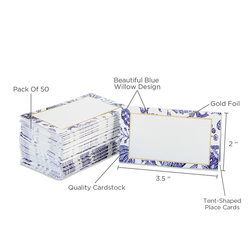 These Blue Willow Tent Cards are perfect for setting up your seating arrangement or displaying a brief description of your food and beverage items. Each card displays an elegant French country motif with a classic blue and white design around the outer edge and an inner gold foil border.