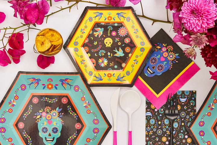Day Of The Dead is a joyous celebration and a beautiful tradition honoring death as a natural cycle of life. In keeping with the Dia De Los Muertos tradition, this hexagon plate features a turquoise sugar skull with colorful flower and leaf adornments on a black background surrounded by a coordinating colorful flower, leaf and bird border on bright turquoise background. Features bright pops of vibrant colors to highlight that death is full of color, not just doom and gloom, as we celebrate the lives of those who are now gone.