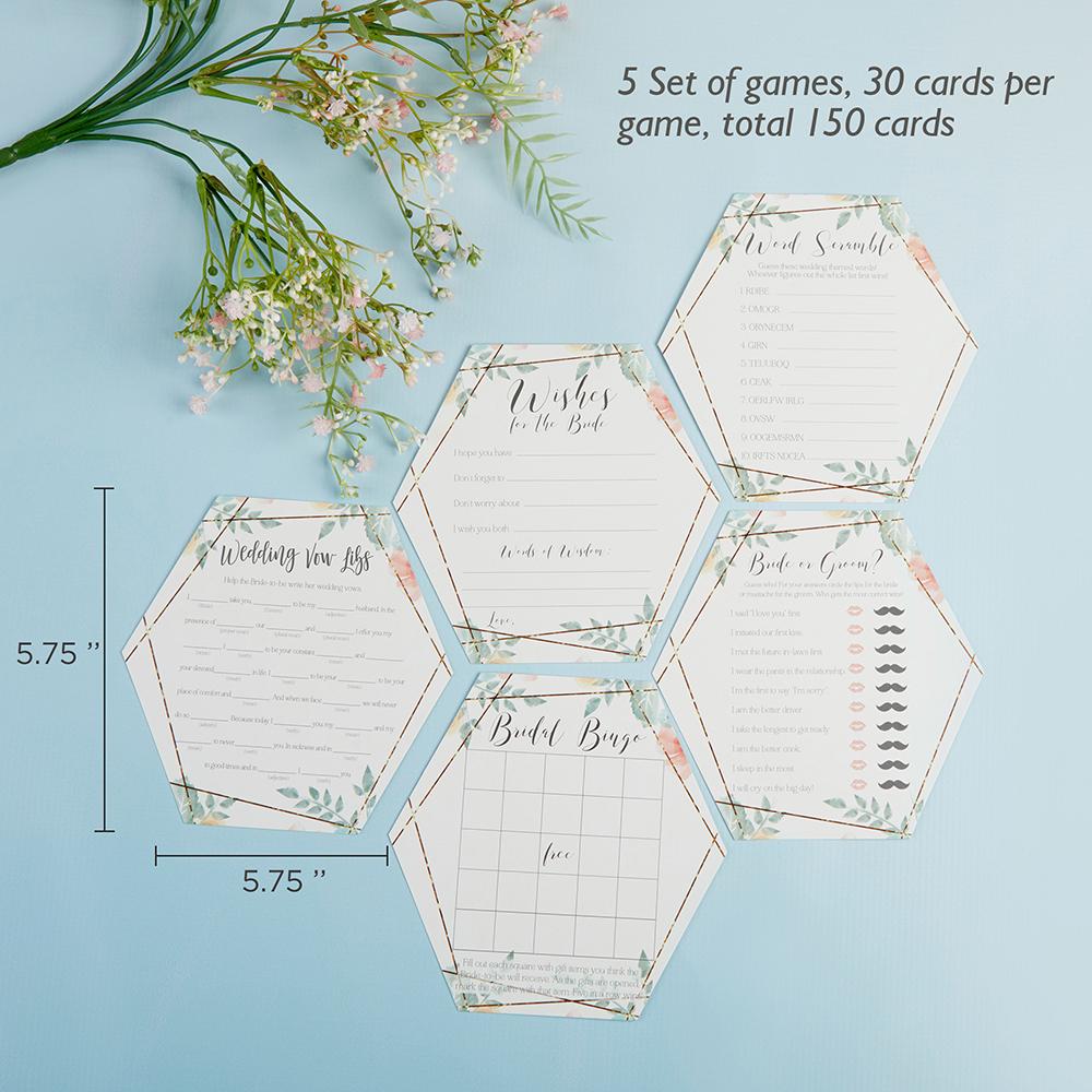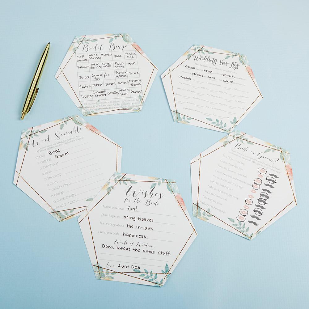 - Each set includes four games including Word Scramble, Bridal Bingo, Bride or Groom, and Wedding Mad Libs and a Wishes for the Bride card