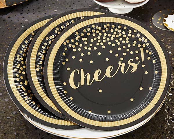 These black and gold foil cheers plates will have everyone toasting! Each plate features a sleek black design with gold foil border and confetti design along with the word "Cheers!" spelled out in a script font across the center of each plate!