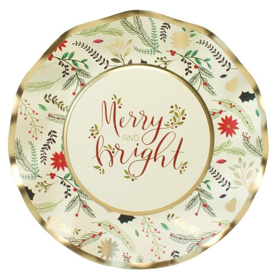 Deck your table with boughs of holly and mistletoe! These gorgeous cream plates feature the phrase "Merry and bright" in the center in red script font adorned with holly and berries surrounded by a border of red poinsettias and green and gold foil holiday greenery trimmed with a gold foil ruffle rim. The epitome of holiday elegance, these plates are perfect for your Christmas dinner or holiday party.