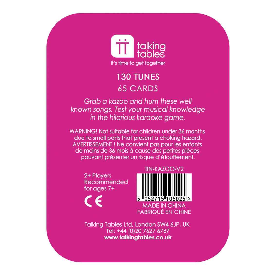 - Game includes 1 tin with 65 cards and 2 mini kazoos