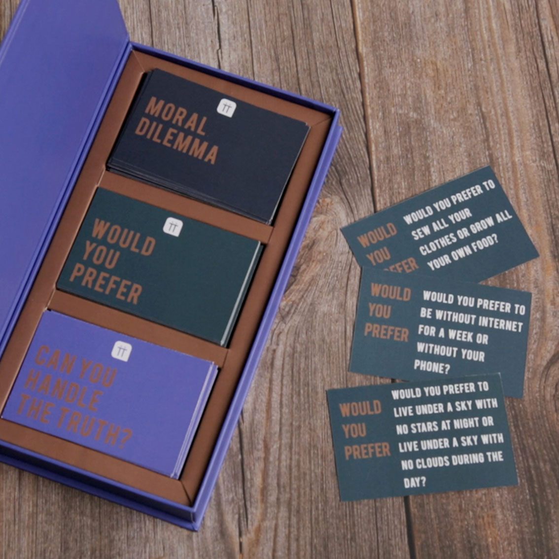Find out how well you really know yourself and your friends with this compendium of three intriguing games that put your moral values to the ultimate test. Includes 'Would You Rather', 'Can You Handle the Truth' and 'Moral Dilemma'. The perfect accompaniment to any dinner party: take turns around the table to answer provocative questions and let the conversations ignite.