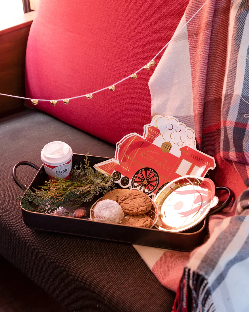 What is more jolly than a jingle bell? Nope, cannot think of anything! Featuring gold foil, these jingle bell shaped plates are trimmed with a red ribbon bow and holiday greenery for a beautiful, and jolly, addition to your holiday table or for snacks on your Polar Express trip to the North Pole.