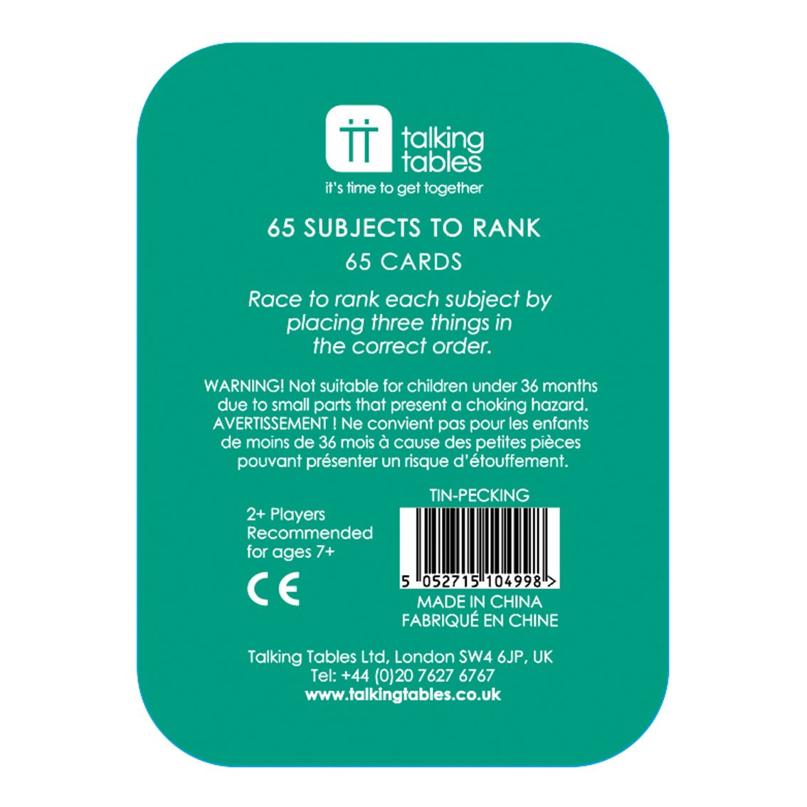 The Pecking Order game is a fast paced game where players race to rank three related items or people in the correct order, as instructed by the subject card. This table game is perfect to play with family or friends and is sure to get everyone talking!