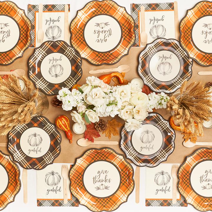 Express thankfulness this year on your Thanksgiving table! These napkins feature the phrase "give thanks" in a dark gray script font, an illustrated pumpkin adorned with wheat pods, and is trimmed in a thick orange, cream, and gray autumnal plaid border. Perfect for your Thanksgiving and Friendsgiving celebrations.