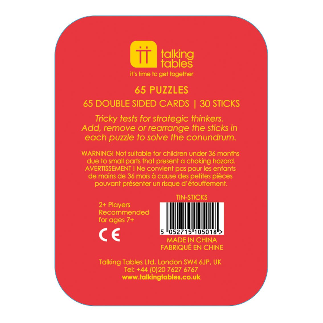 - Game includes 1 tin with 65 puzzles and 20 sticks