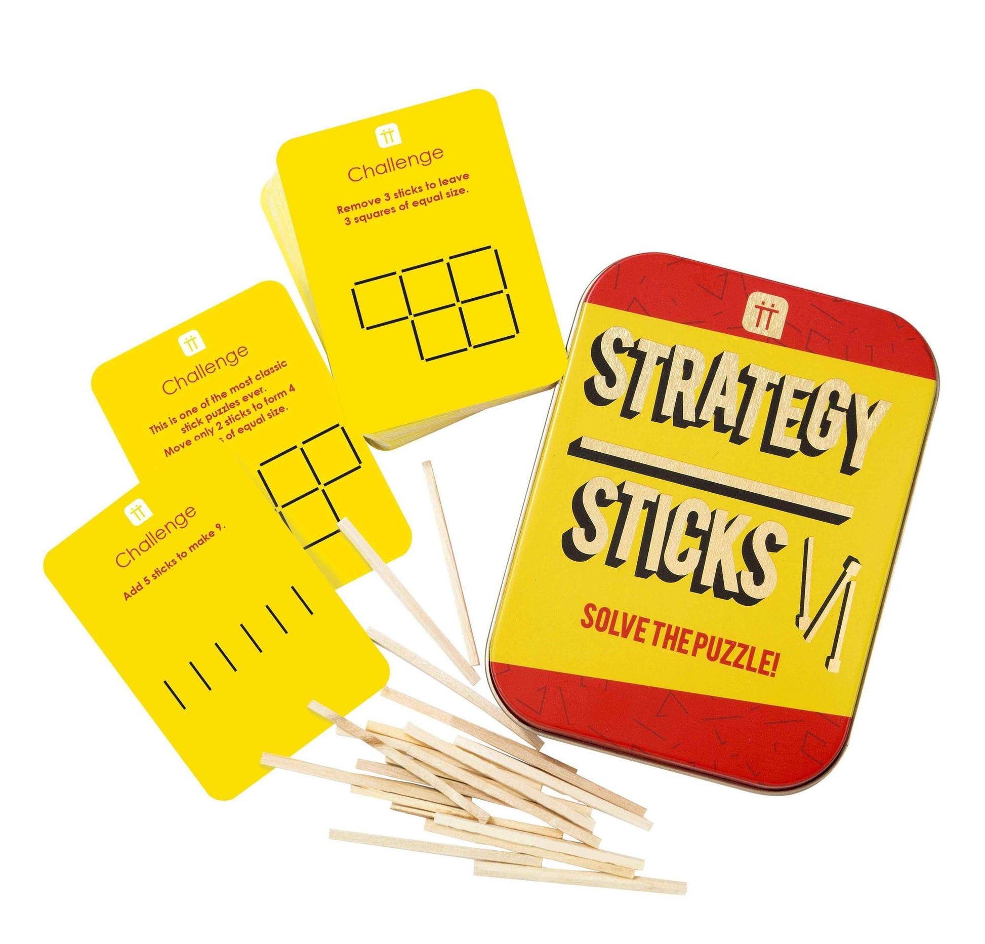 Strategy Sticks in a Tin game provides tricky puzzles for strategic thinkers. Using the 65 puzzle cards, add, remove or rearrange the sticks in each puzzle to solve the conundrum. Play individually or with family or friends to get everyone's brains thinking.
