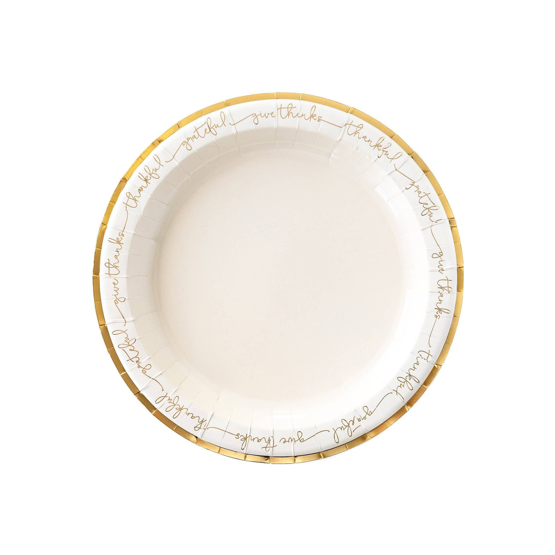 Reflect on the many ways to give thanks as you gather together with these gorgeous cream and gold foil accented plates featuring a border of the words "give thanks, thankful, and grateful" in gold foil script and finished with a gold foil edge. Perfect for your Thanksgiving or Friendsgiving table.
