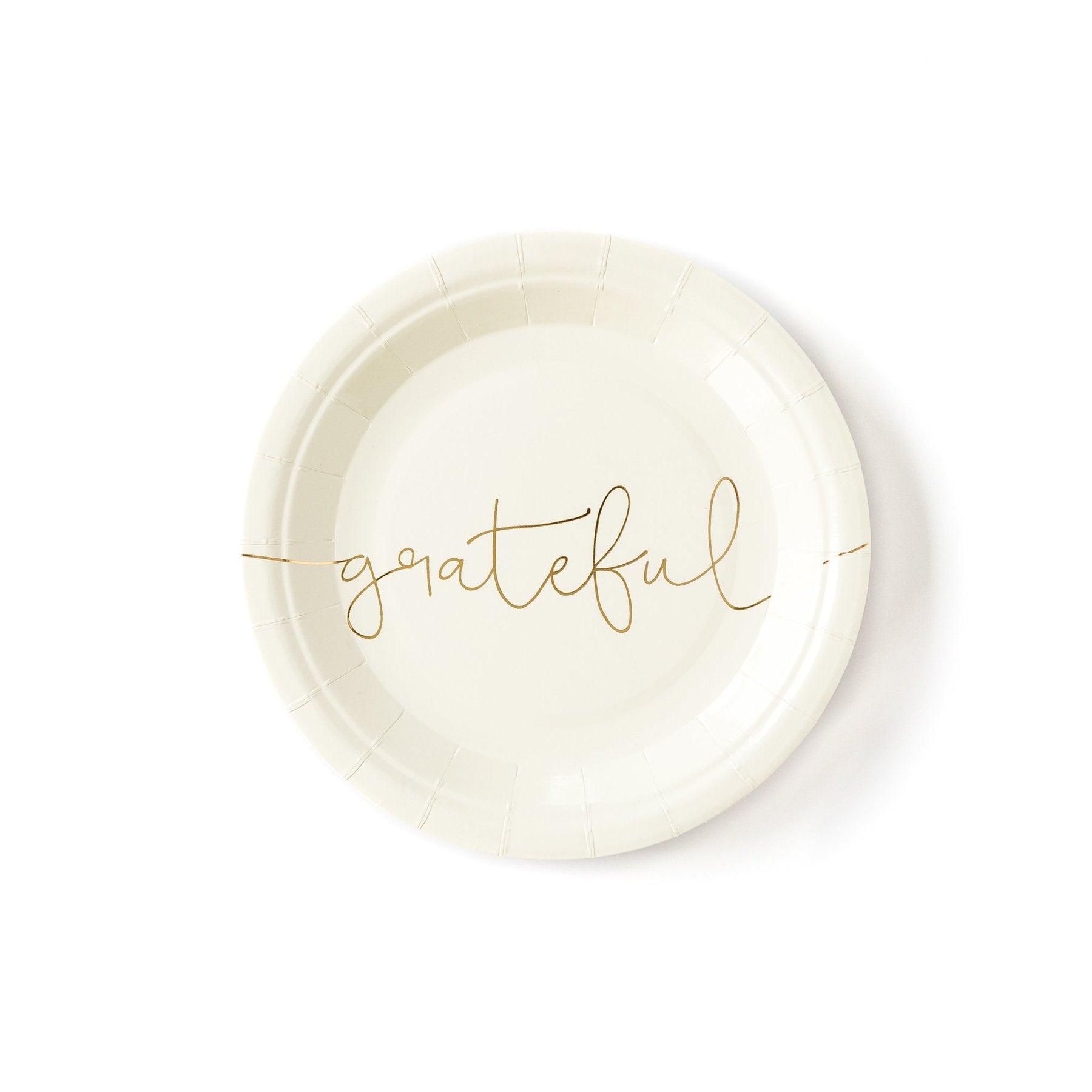 Be thankful and grateful this Thanksgiving with these sophisticated plates. Each cream plate has the word "thankful" or "grateful" printed in a beautiful gold foil script across the plate.