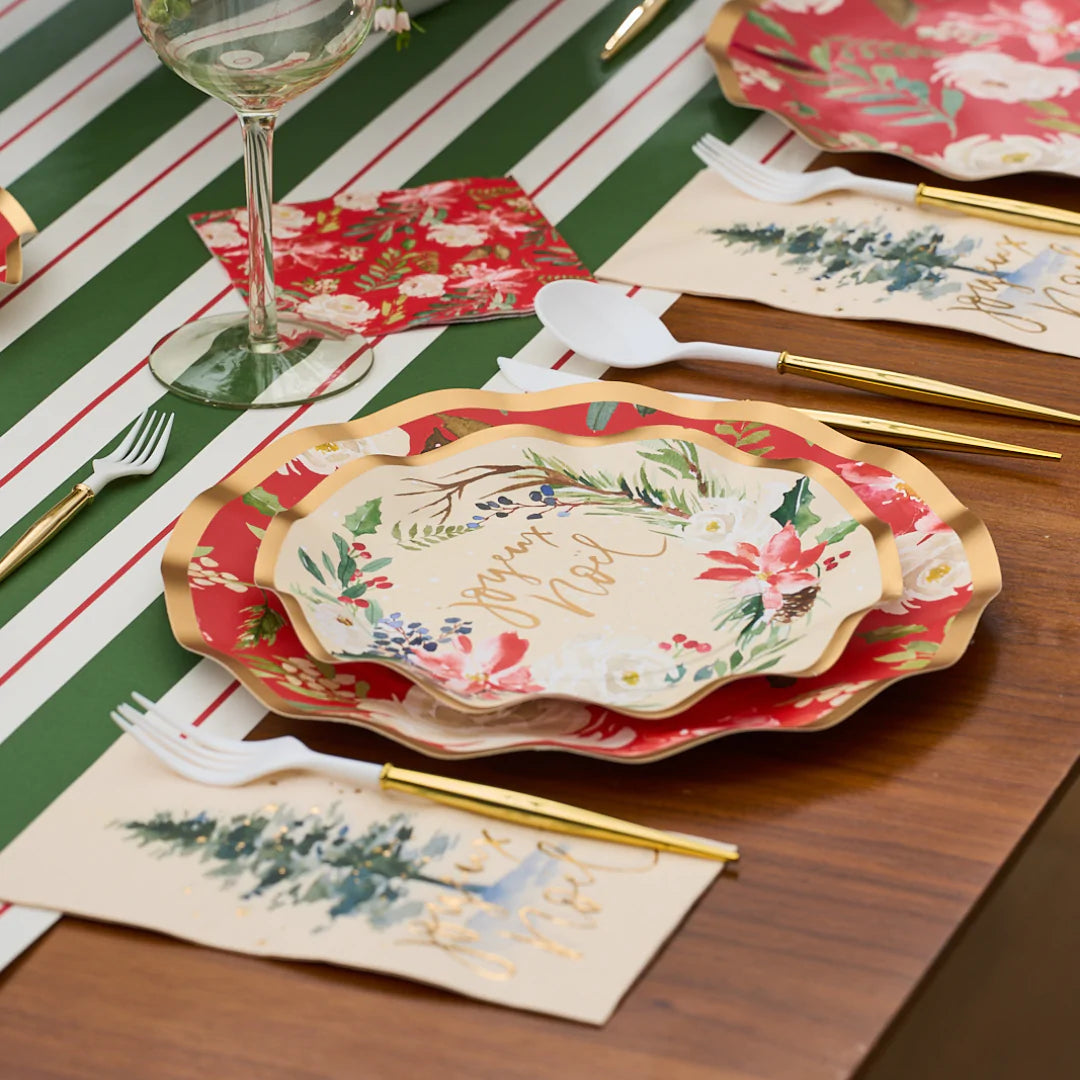 Let your holidays bloom with this beautiful winter floral holiday collection. These gorgeous plates feature "joyeux noel" in the center, surrounded by a wintery floral wreath of white camilas, pale red poinsettias, greenery, pinecone, and berries, and finished with a metallic gold foil ruffled edge. Perfect for your Christmas celebrations.